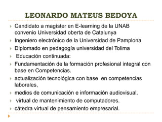 El documento presenta a Leonardo Mateus Bedoya y describe cómo la universidad Unioriente comenzará a utilizar las TIC como recursos de apoyo para las clases presenciales y como complemento del aprendizaje en modalidad b-learning. Se mencionan algunas asignaturas piloto que implementarán el aula virtual y los roles de los docentes y estudiantes en este proceso.