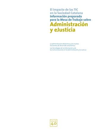 El documento analiza el impacto de las TIC en la sociedad catalana y la administración. Discute cómo el desarrollo autonómico requiere nuevas competencias que conllevan la necesidad de recursos y procedimientos más eficientes. Esto supone adoptar nuevas formas de actuación y coordinación, así como servicios electrónicos accesibles. La e-administración debe ir más allá de la accesibilidad y transparencia inicial para dar soluciones a nuevas demandas ciudadanas y apoyar la competitividad económica, en línea con
