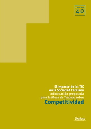 El documento analiza el impacto de las tecnologías de la información y la comunicación (TIC) en la competitividad de la sociedad catalana. Explica que las TIC han contribuido a mejorar la competitividad de la economía de diversas formas, al ser un sector de alto valor añadido y permitir métodos más eficientes de gestión y producción. Sin embargo, Cataluña se encuentra por debajo del promedio de la OCDE en la adopción de TIC. El documento identifica varios factores que inhiben su uso, como la falta de capacitación
