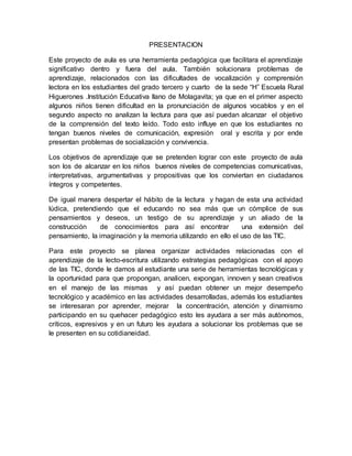 Este documento presenta un proyecto pedagógico de aula que busca mejorar la lectoescritura en estudiantes de tercero y cuarto grado a través del uso de las TIC. El proyecto se enfoca en desarrollar habilidades comunicativas, interpretativas y argumentativas mediante actividades que motiven la lectura y escritura. Se utilizarán estrategias pedagógicas y herramientas tecnológicas para mejorar el desempeño académico y técnico de los estudiantes. El proyecto se