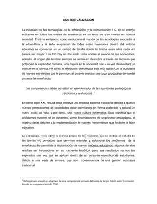 Las TIC son importantes para desarrollar competencias en los estudiantes que les permitan funcionar en la sociedad actual. El documento argumenta que las estrategias docentes deben enfocarse en el desarrollo de habilidades prácticas usando recursos didácticos como las TIC. También sugiere que la educación debe estar contextualizada y vincular los conocimientos con problemas reales para formar estudiantes competentes.