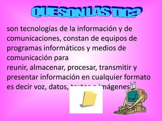 Las TIC, o tecnologías de la información y comunicación, abarcan herramientas y medios que permiten el manejo de información en múltiples formatos. Su impacto es notable en la educación, fomentando la alfabetización digital y la productividad de los estudiantes, y promoviendo metodologías innovadoras. Además, las TIC están relacionadas con diversos aspectos de la vida humana, lo que exige a la educación adaptarse a rápidos cambios tecnológicos para preparar a los estudiantes para el futuro.