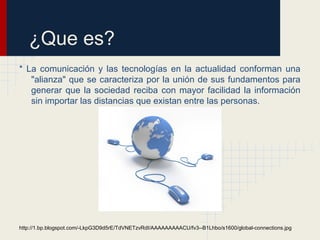 Este documento describe la relación entre la comunicación y la tecnología y cómo se han unido para facilitar el intercambio de información a través de las distancias. Explica que la comunicación es fundamental para el desarrollo social y que las personas deben capacitarse en el uso de la tecnología para funcionar en una sociedad basada en la información. Además, destaca que en la actualidad la cobertura de Internet supera a otras tecnologías de comunicación al permitir acceder a la televisión, la radio y la comunicación entre personas de diferentes lugares.