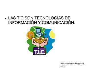 Este documento proporciona una breve introducción a las Tecnologías de la Información y la Comunicación (TIC). Explica que las TIC pueden usarse de manera creativa en las redes sociales para motivar y participar a los estudiantes, y para proporcionar nuevos conocimientos. También señala algunas ventajas de las TIC como el fácil acceso a la información y el apoyo al aprendizaje, aunque existen también desventajas como los actos ilícitos en línea y los riesgos para la moral. Final