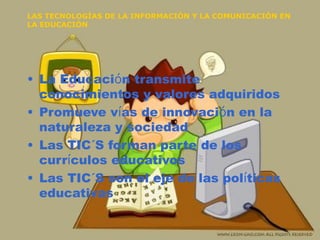 El documento describe el papel de las tecnologías de la información y la comunicación (TIC) en la educación. Explica que las TIC forman parte de los currículos educativos y son fundamentales para las políticas educativas. Detalla cómo los estudiantes, padres, maestros y escuelas pueden beneficiarse del uso pedagógico de las TIC para buscar recursos, comunicarse y desarrollar proyectos colaborativos. También resume las iniciativas de la Unión Europea para promover el aprendizaje electrónico y reducir la