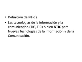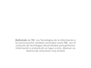 Las Tecnologías de la Información y la Comunicación (TIC) se refieren al conjunto de tecnologías desarrolladas para gestionar y transmitir información. Incluyen una amplia gama de soluciones como software, hardware, internet y redes sociales que permiten crear, almacenar, recuperar, enviar y manipular información.