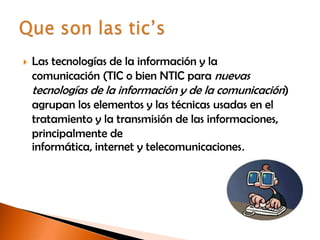 El documento describe las principales tecnologías de la información y comunicación (TIC), incluyendo telefonía fija, telefonía móvil, banda ancha, redes de televisión y servicios. Explica que el uso de las TIC entre los habitantes de una población ayuda a reducir la brecha digital al aumentar el número de usuarios que las utilizan. También describe los diferentes tipos de terminales y las tecnologías para distribuir contenidos de televisión.