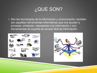 Este documento describe las tecnologías de la información y la comunicación (TIC). Explica que las TIC son herramientas que nos ayudan a procesar y acceder información fácilmente. Relata que las TIC se desarrollaron inicialmente con el teléfono en el siglo XIX y desde entonces han evolucionado para incluir computadoras, celulares, televisión y redes sociales. Finalmente, detalla que las TIC sirven para optimizar la comunicación y el acceso a la información y que proporcionan tanto ventajas como desventaj