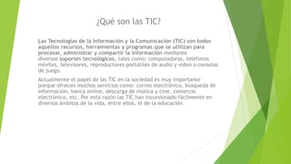 Las Tecnologías de la Información y la Comunicación (TIC) son recursos, herramientas y programas que se utilizan para procesar, administrar y compartir información a través de dispositivos tecnológicos como computadoras, teléfonos, televisores y consolas de juego. Actualmente, las TIC juegan un papel importante en la sociedad al ofrecer servicios como correo electrónico, banca en línea y comercio electrónico. Las TIC también se han incorporado en la educación, transformando la forma de enseñ