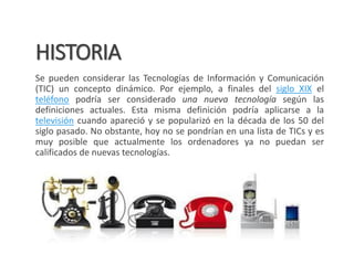 El documento proporciona información sobre las tecnologías de la información y la comunicación (TIC). Explica que las TIC agrupan elementos y técnicas para procesar, almacenar, transmitir y comunicar información, principalmente relacionadas con informática, Internet y telecomunicaciones. También describe brevemente la historia y evolución de las TIC, sus usos crecientes en diferentes ámbitos como la educación, la salud y el comercio, y los tipos de redes, terminales y servicios que conforman las TIC.
