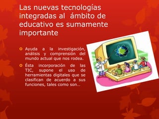 El documento describe las herramientas tecnológicas integradas a la educación y sus funciones. Estas incluyen procesadores de texto para redactar, presentadores de diapositivas para presentaciones, multimedia para imágenes y sonido, y redes sociales para comunicación. El desarrollo de competencias digitales requiere el uso de estas herramientas y la búsqueda, recopilación y difusión de información en diversos formatos.