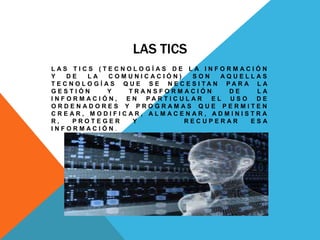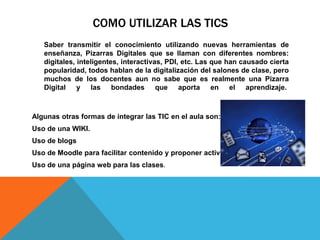 Las TIC son tecnologías como ordenadores y programas que permiten crear, modificar, almacenar, administrar, proteger e recuperar información para gestionarla y transformarla. Algunas formas de integrar las TIC en el aula incluyen usar pizarras digitales interactivas, wikis, blogs, plataformas como Moodle y páginas web para facilitar el aprendizaje.