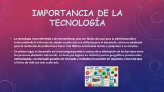 El documento describe la importancia de las tecnologías de la información y la comunicación (TIC) en la sociedad moderna. Las TIC permiten el acceso rápido e ilimitado a la información a través de dispositivos como computadoras y teléfonos. Si bien las TIC tienen beneficios como facilitar la educación y el desarrollo profesional, también plantean desafíos como la adicción tecnológica y la exposición de información personal. El documento analiza tanto las ventajas como los riesgos del uso generalizado de las T