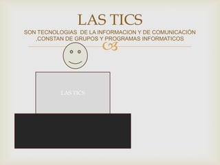 El documento presenta información sobre las tecnologías de la información y comunicación (TICS), incluyendo definiciones de sexting, ciberacoso y ciberbullying. También describe las características de las TICs como la conectividad, digitalización y diversidad, y cómo pueden agruparse según redes, terminales y servicios. El documento concluye agradeciendo al lector.