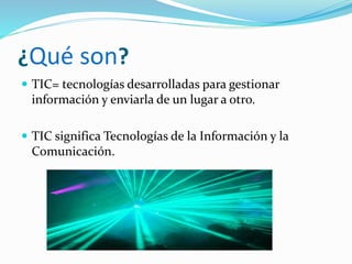 Las Tecnologías de la Información y la Comunicación (TIC) gestionan y transmiten información y son útiles para renovar el sistema educativo al proporcionar información y recursos didácticos a los profesores. Las TIC ofrecen beneficios como aprendizaje interactivo a distancia, nuevas formas de trabajo y acceso a conocimientos, aunque también plantean desventajas como falta de privacidad y aislamiento.
