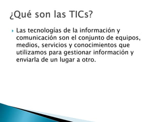 Las tecnologías de la información y comunicación sirven para mejorar la comunicación y transmitir e almacenar información, modificando ámbitos como el trabajo, la educación y las compras. Aunque permiten el aprendizaje interactivo y la educación a distancia, también plantean riesgos como falta de privacidad, aislamiento y engaños en internet.