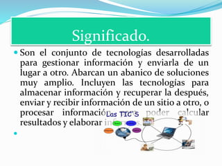 Las Tecnologías de la Información y la Comunicación (TIC) incluyen tecnologías para almacenar, recuperar, enviar e información de un lugar a otro y procesar información. Permiten acceso fácil e instantáneo a información en cualquier formato. Existen redes, terminales y servicios de TIC. Proporcionan beneficios como educación y salud a distancia, pero también riesgos como falta de privacidad y aislamiento.