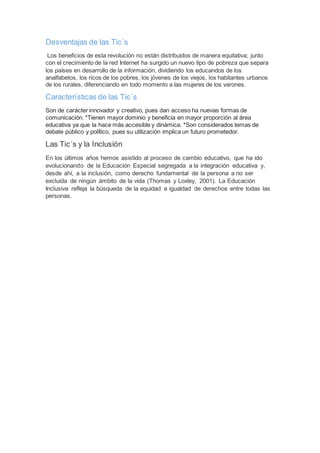 El documento define las TIC (Tecnologías de la Información y la Comunicación) como el conjunto de tecnologías para gestionar y compartir información. Las NTIC (Nuevas Tecnologías de la Información y la Comunicación) han traído cambios económicos a los países industrializados. Las TIC ofrecen ventajas como beneficios en salud y educación, pero también tienen desventajas como la brecha digital entre zonas rurales y urbanas. Las TIC se caracterizan por ser innovadoras y beneficiar el área educativa, a