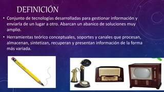 El documento define las Tecnologías de la Información y la Comunicación (TIC) como el conjunto de tecnologías desarrolladas para gestionar y transmitir información. Explica que las TIC representan un cambio significativo en la sociedad que afecta la educación, las relaciones interpersonales y la difusión del conocimiento. También detalla algunas de las posibilidades de uso de las TIC, como el fácil acceso a información, canales de comunicación, almacenamiento de datos y automatización de tareas.