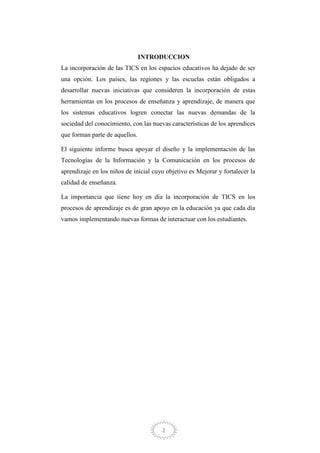 Este informe resume un proyecto sobre el uso de las TIC en el desarrollo de habilidades del siglo XXI en niños de educación inicial. El proyecto capacitó a docentes, implementó recursos digitales en el aula, y motivó a los niños a aprender de manera fácil usando videos, música y juegos. Los resultados mostraron que las TIC facilitan la enseñanza y el aprendizaje cuando son usadas de manera pedagógica.