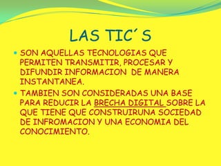 El documento habla sobre las tecnologías de la información y la comunicación (TIC's). Explica que las TIC's permiten transmitir, procesar y difundir información de manera instantánea y son una base para reducir la brecha digital. También menciona algunas ventajas de las TIC's como el interés, la motivación y la interacción, así como algunas desventajas como la falta de privacidad, aislamiento y distracciones. Concluye que las TIC's pueden ser útiles pero también traer consecuencias imprevistas si no se us