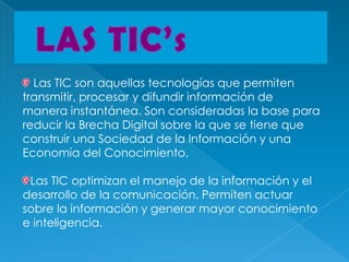 Las TIC permiten transmitir, procesar y difundir información de manera instantánea y son consideradas la base para reducir la Brecha Digital y construir una Sociedad de la Información. Las TIC optimizan el manejo de la información y el desarrollo de la comunicación, permitiendo actuar sobre la información y generar mayor conocimiento e inteligencia.