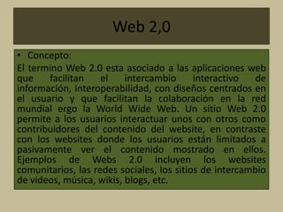 Este documento presenta definiciones breves de varios términos relacionados con la tecnología de la información y la comunicación, incluyendo Web 2.0, Web 3.0, blogs, wikis, Internet, YouTube, Issuu y redes sociales. Explica que estos términos se refieren a diferentes plataformas y aplicaciones web que facilitan el intercambio y creación colaborativa de información entre usuarios.