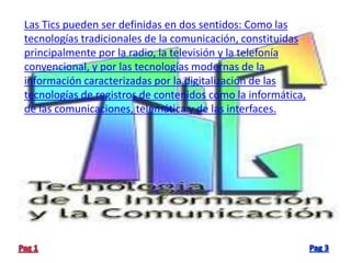 Las TICs pueden definirse como las tecnologías tradicionales de comunicación como la radio y la televisión, así como las tecnologías modernas de la información basadas en la digitalización, como la informática. Las TICs son tecnologías necesarias para gestionar y transformar información usando ordenadores y programas que permiten crear, modificar, almacenar, administrar, proteger e recuperar información. Las TICs incluyen herramientas como tableros digitales, wikis y blogs que permiten procesar, transmitir y dif