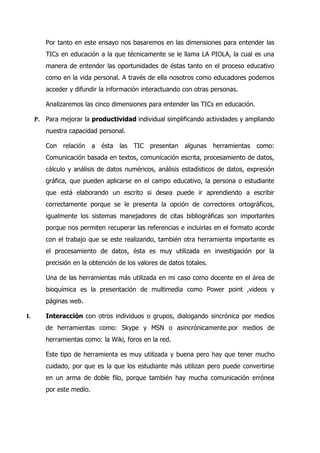 Las TIC se están convirtiendo en una herramienta indispensable en la educación al abrir nuevas posibilidades de comunicación y enseñanza centrada en el estudiante. El documento analiza las cinco dimensiones de "LA PIOLA" para entender cómo las TIC pueden mejorar la productividad individual, fomentar la interacción, ampliar el acervo cultural, apoyar los objetos de estudio y las labores educativas. Sin embargo, se requiere un compromiso institucional para integrar las TIC y aprovechar su potencial para innovar los proces