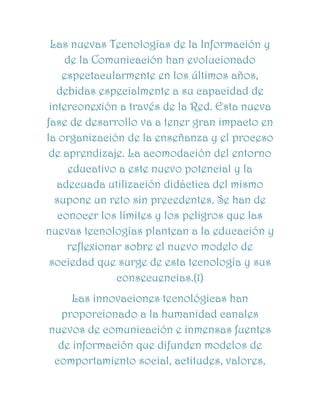 Las Tecnologías de la Información y Comunicación (TIC) han evolucionado rápidamente y tienen un gran impacto en la educación, representando tanto oportunidades como desafíos. Por un lado, las TIC proporcionan nuevos canales de comunicación e información, pero también plantean la necesidad de enseñar a los estudiantes a navegar este exceso de información y participar de forma constructiva en entornos virtuales. Además de las habilidades tradicionales, es necesario enseñar destrezas para operar en la sociedad de