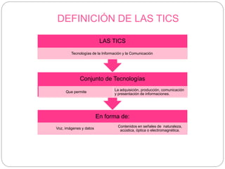 El documento define las Tecnologías de la Información y la Comunicación (TICs) como conjuntos de tecnologías que permiten la adquisición, producción, comunicación y presentación de información. Explica que los docentes deben desarrollar competencias cognitivas, activas y afectivas para integrar las TICs en el aula de manera efectiva. También proporciona recomendaciones para la planificación e implementación de las TICs en las clases, así como las funciones y ventajas que aportan a la educación.