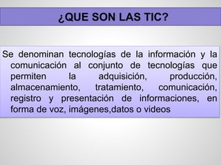 Las TICs permiten la adquisición, almacenamiento, procesamiento y transmisión de información de forma fácil y en tiempo real. En la educación, las TICs pueden contribuir al acceso universal a la educación y mejorar la enseñanza y el aprendizaje a través de formatos multimedia e información ilimitada. El uso de las TICs en el aula moderniza la forma de impartir conocimientos y motiva a los estudiantes al permitir un aprendizaje autónomo, colaborativo y significativo.