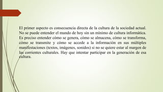 Este documento discute el papel de las tecnologías de la información y la comunicación (TIC) en los procesos de enseñanza y aprendizaje. Argumenta que las TIC se han vuelto fundamentales en la sociedad moderna y deben integrarse en la educación. Propone dos enfoques: 1) enseñar sobre las TIC para que los estudiantes comprendan la cultura digital, y 2) usar las TIC como herramientas de enseñanza y aprendizaje. Finalmente, enfatiza la importancia de capacitar a los maestros en