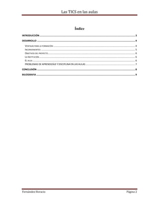 Este documento describe las ventajas y desventajas del uso de las tecnologías de la información y la comunicación (TIC) en las aulas. Las TIC pueden eliminar barreras espacio-temporales, aumentar la información disponible, y crear escenarios más atractivos para el aprendizaje. Sin embargo, también pueden provocar un exceso de información y requieren una gran inversión económica. El documento concluye que a pesar de los inconvenientes, las TIC son beneficiosas y necesarias en la escuela moderna si son utilizadas