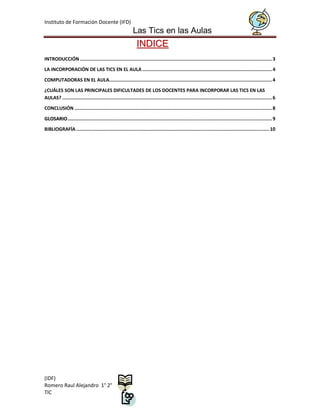 El documento discute la incorporación de las tecnologías de la información y comunicación (TIC) en las aulas. Señala que si bien es necesario adoptar nuevas tecnologías, también es importante reformular aspectos del sistema educativo. Explica cómo se han incorporado las computadoras en las aulas y los desafíos que enfrentan los docentes, como falta de capacitación, problemas técnicos y falta de motivación. Concluye resaltando la importancia de enfocar las problemáticas derivadas del impacto de las TIC en la educación.