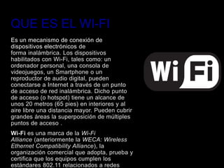 El documento presenta información sobre Wi-Fi, wikis, redes WAN y LAN, comunicación inalámbrica, libros digitales y las TIC. Explica que Wi-Fi permite la conexión inalámbrica de dispositivos a Internet, que los wikis son sitios web cuyas páginas pueden ser editadas por múltiples usuarios, y que las WAN cubren amplias regiones geográficas mientras que las LAN son redes privadas dentro de un edificio.