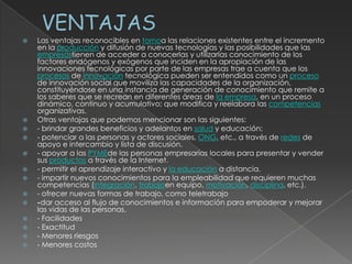 Este documento describe las ventajas y desventajas de las tecnologías de la información y la comunicación (TIC). Entre las ventajas se encuentran que brindan beneficios en salud y educación, potencian a las personas y organizaciones, apoyan a las pequeñas y medianas empresas, permiten el aprendizaje a distancia y ofrecen nuevas formas de trabajo. Sin embargo, las desventajas incluyen que los beneficios no están distribuidos de manera equitativa, creando una brecha digital entre ricos y pobres, y también pueden