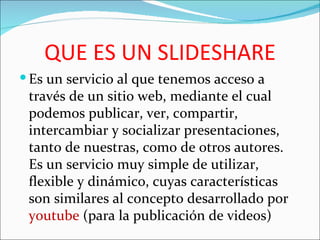Este documento describe SlideShare, un servicio web que permite a usuarios publicar, compartir y ver presentaciones de diapositivas. SlideShare ofrece una alternativa para compartir presentaciones sin adjuntar archivos pesados en correos electrónicos o publicarlas en sitios web o blogs. El documento anima a los lectores a experimentar SlideShare y aplicar esta herramienta en el trabajo y estudio, así como compartir el aprendizaje con estudiantes.