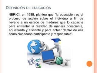 Este documento define la educación como un proceso de acción sobre los individuos para llevarlos a un estado de madurez que les permita enfrentar la realidad de manera consciente, equilibrada y eficiente. Señala que los docentes tienen la mayor responsabilidad sobre el proceso educativo y deben crear ambientes de aprendizaje que permitan a los estudiantes construir conocimiento de manera activa y colaborativa. Además, sugiere que los docentes deben reformular sus actividades utilizando las TICs para favorecer el desarrollo integral