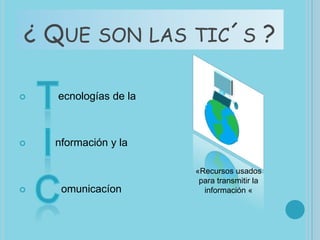 Este documento describe las tecnologías de la información y la comunicación (TIC's) y la Web 2.0. Explica que las TIC's incluyen recursos como redes, terminales como computadoras y dispositivos móviles, y servicios como internet y telefonía. También discute ventajas de las TIC's como acceso a recursos educativos, pero también desventajas como posible adicción a redes sociales. Finalmente, menciona que la Web 2.0 incluye servicios como wikis y redes sociales.