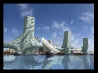 Este documento presenta varios proyectos arquitectónicos innovadores realizados gracias a los avances técnicos. Describe torres con formas orgánicas como terrazas arbóreas, flores, corales y formas retorcidas construidas en ciudades de China, Dubai, Singapur, Armenia y Estados Unidos.