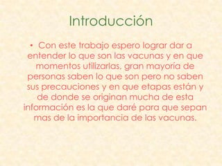 Este documento proporciona información sobre las vacunas, incluyendo su definición, tipos, historia, desarrollo de la inmunidad, aspectos económicos y éticos. Explica que las vacunas preparan el sistema inmunológico contra enfermedades y han ayudado a erradicar viruela y reducir otras. También cubre los diferentes métodos para producir vacunas, como las atenuadas y las inactivadas, y destaca los avances históricos en el desarrollo de vacunas para enfermedades como la polio, el sar