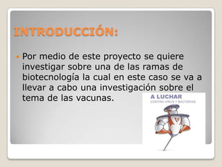 Este documento proporciona información sobre vacunas. Define vacunas y explica cómo funcionan estimulando la producción de anticuerpos sin causar la enfermedad. Describe los cuatro tipos principales de vacunas y proporciona una cronología del desarrollo de vacunas a través de los siglos. El documento concluye que las vacunas han ayudado a prevenir muchas enfermedades comunes y salvar vidas.