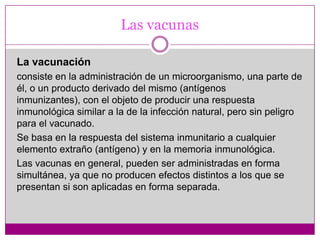 Este documento resume los diferentes tipos de vacunas, incluyendo vacunas de microorganismos vivos atenuados, microorganismos enteros inactivados, polisacáridas, proteínicas purificadas, conjugadas, y recombinantes. También describe brevemente el origen de las vacunas con Edward Jenner y Louis Pasteur, y proporciona una cronología del desarrollo de vacunas a través de los siglos 18 al 21.