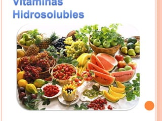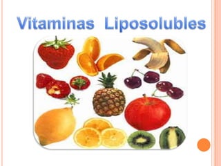 Este documento trata sobre las vitaminas. Brevemente describe que las vitaminas son compuestos heterogéneos esenciales para la vida que no pueden ser sintetizados por el organismo y deben obtenerse a través de los alimentos. Además, clasifica las vitaminas en liposolubles (A, D, E, K) y hidrosolubles e identifica algunas fuentes alimenticias importantes de cada tipo de vitamina.