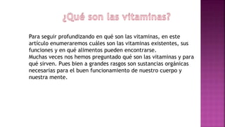 Este documento describe las vitaminas, incluyendo que son sustancias orgánicas necesarias para el buen funcionamiento del cuerpo, se dividen en hidrosolubles y liposolubles, y cada una cumple funciones específicas y se encuentra en alimentos particulares. La carencia de vitaminas puede ocasionar varios problemas de salud, por lo que es importante obtenerlas a través de una dieta balanceada y variada.