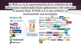 La Web 2.0 representa la evolución de las aplicaciones tradicionales a aplicaciones enfocadas en el usuario final. No es una tecnología en sí, sino una actitud de enfocarse en el usuario, la colaboración y los servicios en línea. Algunas tecnologías que apoyan la Web 2.0 incluyen Ajax, wikis, redes sociales y darle control a los usuarios sobre su información.