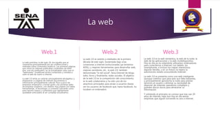 La web 1.0 era estática y unidireccional, mientras que la web 2.0 permitió la compartición de contenidos y redes sociales. La web 3.0 es dinámica y "inteligente", aprovechando la nube y dispositivos múltiples. Caracteriza a la web 1.0 como divulgativa con contenido difícil de actualizar, a la web 2.0 como colaborativa y social, y a la web 3.0 como semántica, en la nube y para múltiples dispositivos.