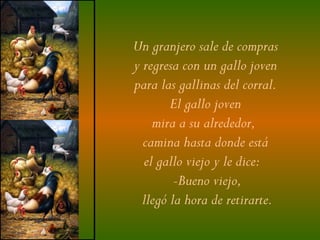 El gallo viejo desafía al gallo joven recién comprado a una carrera para demostrar quién está a cargo del gallinero. Aunque el gallo joven se burla de que ganará fácilmente, durante la carrera el granjero mata de un disparo al gallo joven al confundirlo con un gallo maricón. Esto demuestra que la experiencia del gallo viejo le permitió ganar la carrera y mantener el control del gallinero.