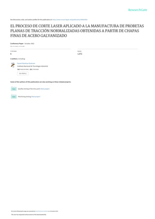 Este documento compara las propiedades geométricas, de superficie y mecánicas de probetas planas de tracción normalizadas fabricadas mediante fresado y corte láser a partir de chapas finas de acero galvanizado. Los resultados muestran que ambos procesos cumplen con los requisitos dimensionales y que las diferencias en las propiedades mecánicas se encuentran dentro de los márgenes de incertidumbre. Aunque el corte láser genera una superficie con mayor rugosidad y una zona afectada térmicamente, est